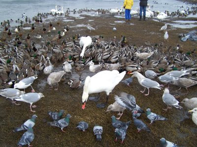 When you are cold and hungry it does not seem to matter who else is around. Very few of these hundreds of birds was much concerned with other birds. Their main concern was to get a share of the food. Ducks, ducks and more ducks, swans, gulls, pigeons....they all were tryin to come in from the cold for a snack. I never realized just how big those swans are when they are out of the water. One was standing on my toes. This is Esquimalt Lagoon which is a bird sanctuary. It is next to Fort Rodd Hill one of Victoria's attractions. The lagoon is worth a visit by itself.